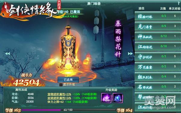武侠世界里的高手形形色色,有人喜好明刀明枪的直面进攻,也有人擅用暗器致敌人于死地。纵观众多武侠作品中总是少不了暗器的身影,比如暴雨梨花针、附骨针、血滴子等,都是一等一的杀人暗器。在《剑侠情缘兵器谱》里,唐门长老将亲自为各位打造的绝世暗器,只需完成特定的任务和副本即可获得暗器经验,当暗器经验达到升级条件后,即可为暗器升级,暗器升级后可激活不同暗器外形,等级越高暗器的外形越酷炫,激活高等级暗器后还可获得丰厚奖励。