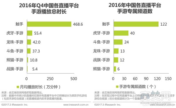受益于平台相对较多的手游专属频道数,触手及虎牙手游频道在2016年Q4平台手游播放总时长上同样处于领先位置,而历来重视腾讯系手游主播培养的龙珠手游频道在播放时长上以微弱的优势反超斗鱼手游频道排名第三,可见龙珠tv对旗下手游频道及相关主播的重视程度还是相对较高的。