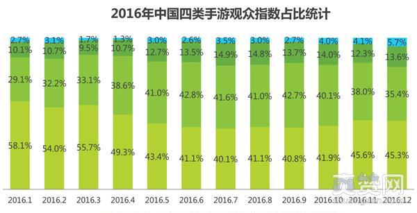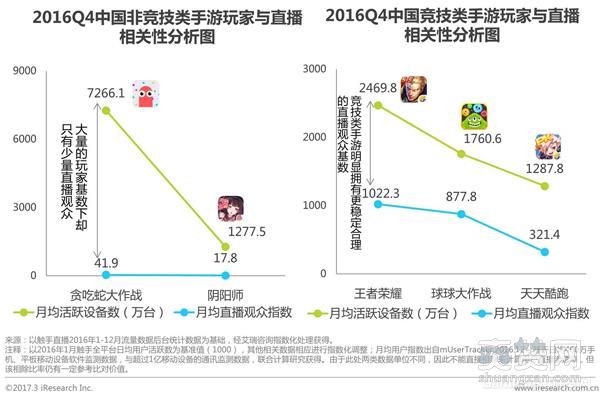 2016年全年超八成手游直播平台观众选择了观看竞技类手游的直播。2016年Q4,重度竞技类手游直播收视占比再度攀升,超越轻度竞技类手游内容,成为年度观众最偏爱的直播类型。艾瑞咨询认为,多场重量级年度手游竞标赛的举办是帮助重度竞技类手游直播在年末吸引流量的最主要原因。值得注意的是,与年初分布情况相比,单机类及非竞技类联机类手游的直播收视占比也有不同幅度的提升,可见移动游戏直播平台的直播品类正逐渐变得多元与丰富。