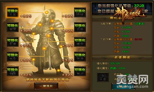 游戏中玩家可以使用铜钱来进行装备强化,强化成功后会提升装备的属性加成。当每个部位的装备都强化到一定等级,将会激活套装属性,提供套装属性加成。与很多游戏不同的是,神魔传说中装备可以强化的等级和角色等级一致,也就是说角色等级越高,装备所能强化的等级也就越高。