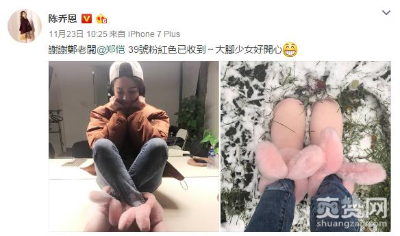 11月23日陈乔恩在微博晒出一张穿雪地靴的萌照,图中陈乔恩穿着带有兔子耳朵的靴子,双腿交叉坐在桌子上,双手托腮十分可爱。陈乔恩配文称:“谢谢郑老板,39号粉红色已收到,大脚少女好开心。 原来,这双毛茸茸有着兔子耳朵的粉色雪地靴是郑恺送给陈乔恩的。萌照一出引来众网友纷纷点赞,但也有网友的关注点在陈乔恩的39码脚,调侃道,“39号的鞋码是亮点”;“大脚能走遍天下!”