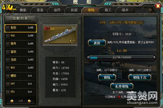 43u《第一舰队》中舰船的养成主要分为舰船培养和舰船精工,舰船培养能提高舰船的等级,高级的舰船拥有更好的属性。玩家们培养时可以用训练令及金币、礼券进行培养,不同颜色的舰船培养需要的培养令或金币不同,依次是红、金、紫、蓝、绿,当有不需要的舰船时,可以选择退役将该舰船变回1级,同时根据舰船的等级返还训练令。