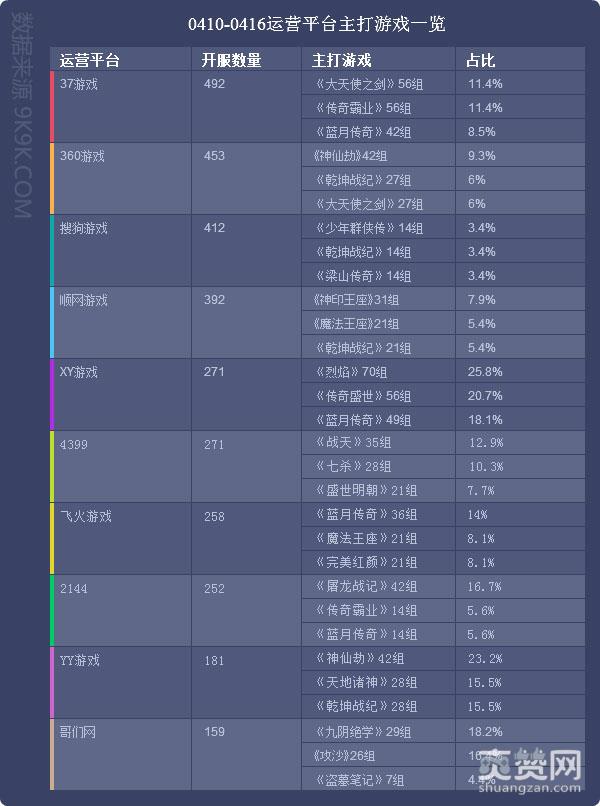 点评: 本周各运营平台主打游戏分布情况与上周变化不大;360游戏《乾坤战纪》升为平台主打游戏,开服频率为4服/天;顺网游戏则是将《神印王座》推为平台第一主打游戏,开服占比为7.9%,日开服频率也达到了4服/天。