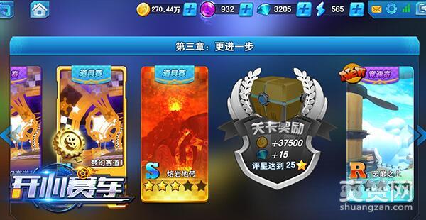 腾讯《开心赛车》中的单人冒险模式,根据赛道剧情分章节呈现。每一章节中共有10张地图,每三节有一关卡,达到指定评星可以激活领取关卡奖励,奖励包括游戏内金币与钻石等高价值道具。通过重重关卡的磨练,玩家的赛车实力将不断加强,学会赛车技巧后可别忘了去多人竞技中大显身手哦!