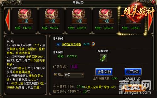 对许多玩家来说,天书任务算是一个非常新奇的任务系统。不过难度比较高,完成这些任务根据完成度可以分为星等,最高为10星,而玩家们只要完成天书任务9星以上的话,就可以获取到传说中的道具。所以对于这种非常重要的任务,玩家可要谨慎再谨慎噢~只要玩家满40级后,就可以到51《烈火战神》土城的人物公告板处接到烈火战神天书任务,而天书任务的经验奖励明显是所有任务中最高的,如果玩家RP不好做到其他更高奖励的任务的话,那就只能另当别论了。玩家每天有10次机会, 所以一定不要错过机会哦!