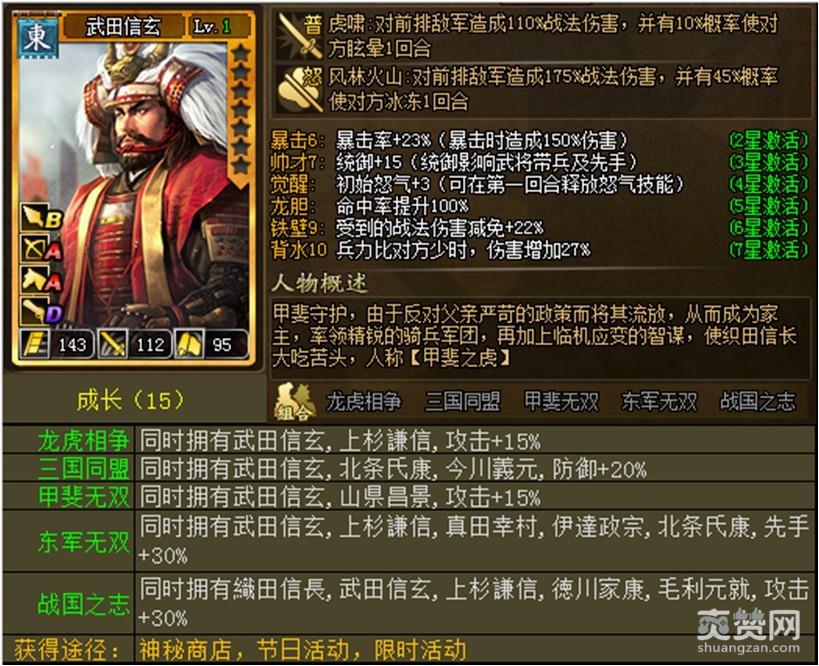 人称“甲斐之虎”,被誉为战国时代的第一兵法家。所出身的武田家族是属于清和源氏一脉的新罗三郎源义光的后裔,他是甲斐守护武田信虎的长子,本名晴信(“信玄”是出家入道后的法名)。因为崇拜孙子,以《孙子兵法·军争篇》中的“其疾如风,其徐如林,侵掠如火,不动如山”中的“风林火山”四字为军旗。于1547 年制定《甲州法度之次第》,训练出了战国最强的武田军团。