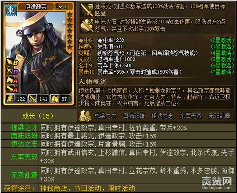 第十七代当家伊达政宗幼年时因得了天花而失去一只眼睛,但凭借其勇猛果敢的作风被称为“独眼龙政宗”,其麾下火枪骑兵纵横无敌。伊达政宗的领地不断扩大,1585 年在二本松城降服了畠山义继他与北条、德川等东部势力结成盟约,准备共同抵抗丰臣秀吉,但德川家康先自臣服于秀吉,丰臣大军杀入北条领,政宗犹豫了很久,最终还是亲自前往秀吉阵中,表示愿意接受对方的领导。