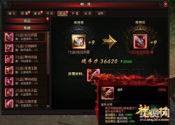 为了你我能征服大江南北,沉鱼落雁也难望你项背,37《神鬼无双》在玩家等级达到125级时开启炼神系统。玩家穿戴任意一件100级以上橙色装备都可进行炼神,将其提升为红色装备。在37《神鬼无双》炼神功能中开启红装之后,还可使用“魔·武器道具”来为红装升级,这些道具可通过炼狱BOSS、神魔宝库来获得。