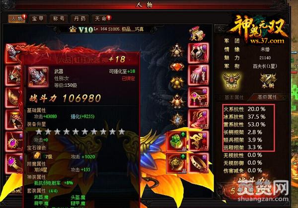 37《神鬼无双》红装不仅战斗气质炸裂,更是战斗实力的象征。玩家穿戴红色装备可获得神装属性和套装属性,雷抗、火抗、冰抗可以在PVP中发挥强大作用,不仅能抵消大招的巨额伤害,还能在群战中屹立不倒。同时,穿戴红色装备之后,长柄、短兵、远程三系武器的招架也会随之提升,战力的上涨可谓飞一般的跨越。