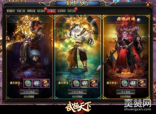 当完成【神凰秘境】15关副本任务,且成为《武极天下》VIP的玩家即可进入VIP副本感受刺激非凡的猎杀行动。点击【副本大厅】—进入【VIP副本】,能够看到三个凶神恶煞的BOSS,从左至右VIP等级依次提升,奖励也越好。每名玩家每日最多可挑战3个BOSS,全部通关奖励更丰厚!