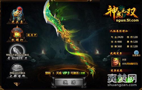 既然上文提到了青龙偃月刀那么就跟大家说说这个兵器,在51《神鬼无双》中大家登陆天数达到5天就可以直接激活了哦,既然是关羽的兵器那么在关键时刻自然是可以变身关羽的,变身之后有两个技能,一个是电刃连斩、另外一个是闪电风暴,这种强悍的输出也是没sei了呢!