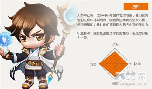 天书中记载,法师可以与世界之树沟通,他们在沟通的过程中得到启示,学会操控元素的强大力量,这种神秘的力量让他们拥有世人无法企及的战斗力.职业特点:拥有极强的法术伤害能力,但是防御能力一般.攻击属性:5星,防御属性:4星,机动属性:4星,操作难度:4星.