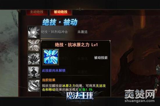 被动绝技,是一项极为特殊的被动技能设定——所有的被动绝技,其作用都在于克制玩家的觉醒技能,每一项被动绝技都与玩家的觉醒技效果逐一对应。例如,被动绝技“抗冰原之力”,可抵抗觉醒技能“冰原之力”,使其“无法攻击和移动”效果的触发概率下降,而被动绝技“抗神圣禁锢”,则会让“神圣禁锢”觉醒技的“无法移动并受到暴击概率提升”效果的触发概率降低。