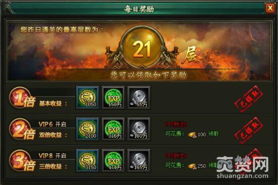 此前小编在通关21层的时候,大把的陨玉就摆在我面前,关键在于自己如何选择。不过非常遗憾,小编作为VIP3也只能领取区区1倍奖励,也就是现在大家看到的背包内的1050个陨玉。只恨自己不是傲天盗墓笔记VIP6或VIP8,否则2100/3150个陨玉3倍收益,陨玉、经验值、银币都如同探囊取物。
