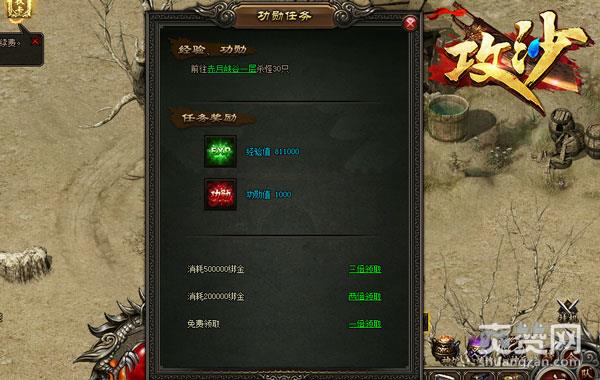 1、在游戏中,玩家完成功勋任务需消耗绑金刷新任务品质和领取多倍奖励;