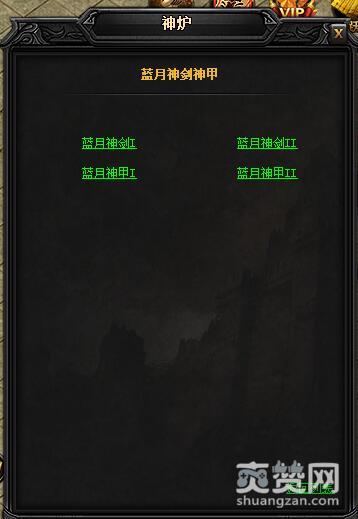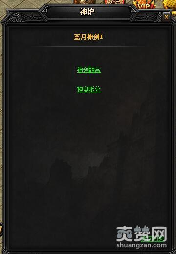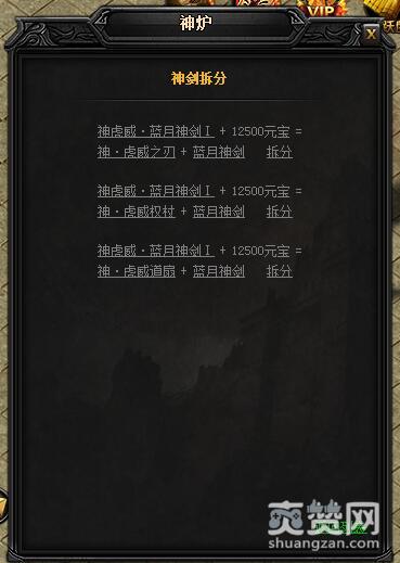 拆分的方法是到神炉处,点击蓝月神兵中的神剑神甲,然后在弹出的对话框中选择一项。这里我们选择的是蓝月神剑I。