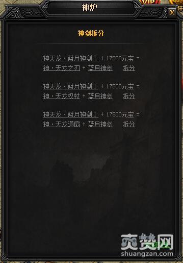 拆分的方法是到神炉处,点击蓝月神兵中的神剑神甲,然后在弹出的对话框中选择一项。这里我们选择的是蓝月神剑I。