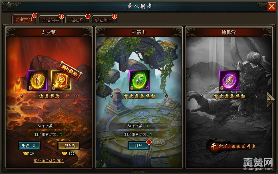 玩家若想提升战斗力,最直接的方法就是六个职业升星进阶。其实,只要玩家耐心足够,就可狂刷六道材料,这样高级别还是不是分分钟的事?但是职业材料哪儿来呢?当然是六道材料副本。当玩家等级达到12级或者是解锁新职业角色时,就可挑战相应的职业副本,从而获得职业升级材料。玩家只要点击主界面上的单人副本,点击六道材料就可进入挑战。每个材料副本每次课免费挑战一次,每天的0点将会重置次数。若当天的每个副本的免费次数消耗完毕,玩家则可消耗一定的元宝重置副本,每日最多可重置20次。在花费元宝重置副本后,就可立即扫荡来获得特殊重置副本奖励哦!玩家每次通关或重置副本都可获得副本通关奖励,期间还有可能获得珍稀奖励哦!