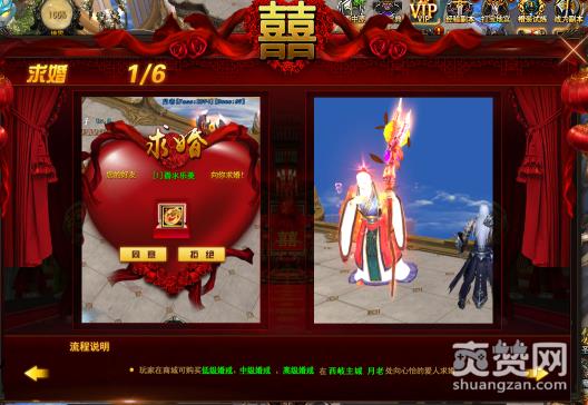 新婚之前总是要安排好一切的,现在,让我们来了解一下具体的婚礼步骤吧。首先,必定是异性人物,咳咳,腐女们就暂且在脑海里描画一下吧。玩家可在商城购买戒指,那么接下来,就去月老那里像你心爱的她求婚吧~