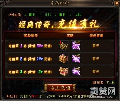 活动详情:活动期间,累计充值元宝数达到要求即可参与排名活动,活动结束时,排行前三玩家可获得丰厚奖励!