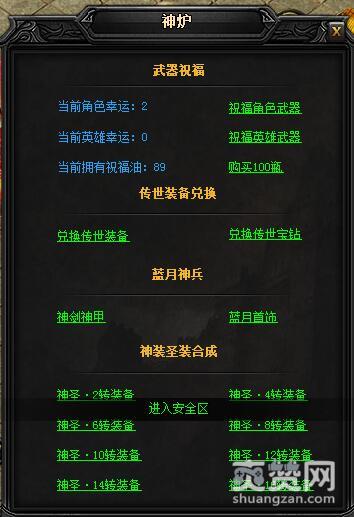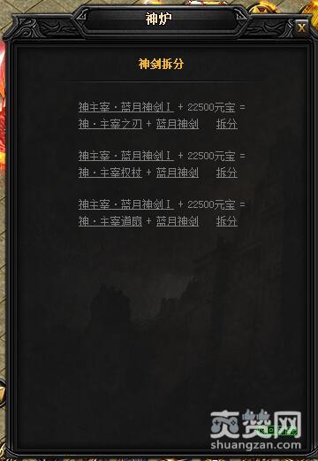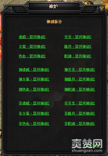 拆分的方法是到神炉处,点击蓝月神兵中的神剑神甲,然后在弹出的对话框中选择一项。这里我们选择的是蓝月神剑I。