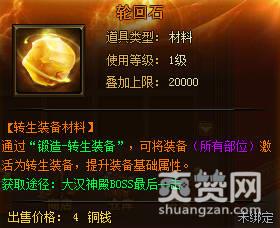 轮回石。转生装备材料。通过“锻造-转生装备”,可将装备(所有部位)激活为转生装备,提升装备基础属性。获取途径:大汉神殿BOSS最后一击