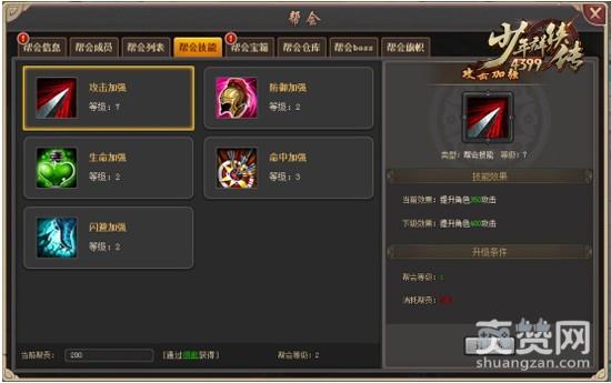 2、帮会技能可以消耗帮贡进行升级,等级越高,效果越强。