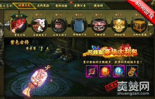 除了签到游戏会给奖励,在玩家登录的七天里,每一天玩家都可以领取相应的奖励,登陆第一天就可以获得宫羽右饰,50级的绿色装备,帮助我们增加大量的生命值,提升我们在游戏中的生存能力。高级修炼令*3,在修炼中可以使用,让我们在每5秒钟就可以获得3倍经验的加成,持续时间是5分钟,是我们在游戏中练级的好帮手。