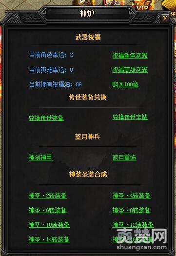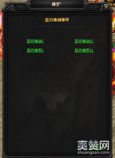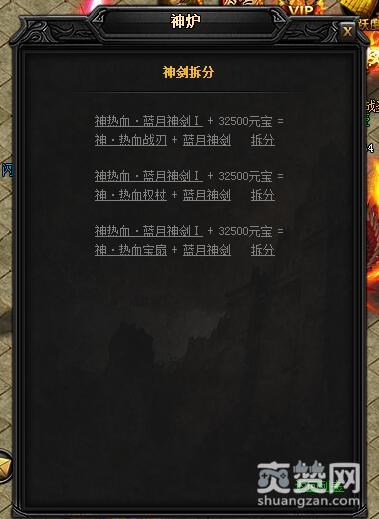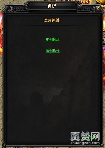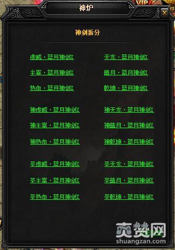 拆分的方法是到神炉处,点击蓝月神兵中的神剑神甲,然后在弹出的对话框中选择一项。这里我们选择的是蓝月神剑I。