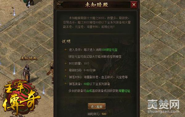 1、未知暗殿进入条件:不限等级,玩家每次进入只需消耗500绑定元宝。大家注意,是每次哟!为了让500绑元物超所值,小编建议进入暗殿就燥起来吧,每个BOSS都轮一遍,不要放过每一件好装备!