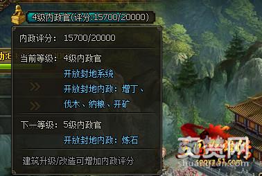 在51三国群雄传中每一个玩家都想拥有自己的封地进行大量的资源补给,此次推出的新版封地玩法,便满足了玩家的野心。当然想要开疆扩土,挥斥方遒,必须得拥有一定的资本。那就是内政评分,51《三国群雄传》升级建筑便可获得内政评分,评分达到等级便可荣升内政官,为抢占封地奠定基础。