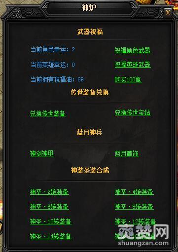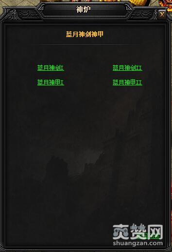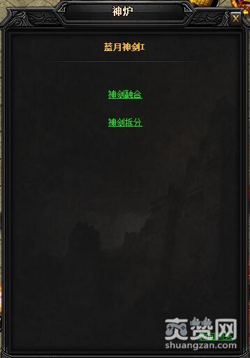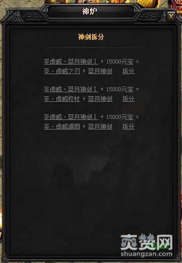 拆分的方法是到神炉处,点击蓝月神兵中的神剑神甲,然后在弹出的对话框中选择一项。这里我们选择的是蓝月神剑I。