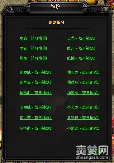 拆分的方法是到神炉处,点击蓝月神兵中的神剑神甲,然后在弹出的对话框中选择一项。这里我们选择的是蓝月神剑I。