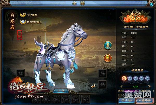 想要收获得多就要付出得多,所以当37《绝世仙王》里的坐骑阶数越高时,每次进阶消耗的坐骑进阶丹就会越多,坐骑不仅是升阶可以增强实力,玩家们还可以为自己的坐骑安上装备哦!在界面中央有四个坐骑的装备位,装备上对应的物品后,坐骑便会对角色产生相应的属性加成。