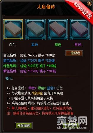 太庙偷砖,从本国接任务,经过边境到达国外的太庙处,拆除太庙回国建设太庙任务完成,此任务有风险,建议组团去国外完成。刺杀太子,本国王接任务,经过边境到达外国的王城王宫去击杀太子,太子死亡后,任务完成,此任务有风险,建议组团去国外完成。