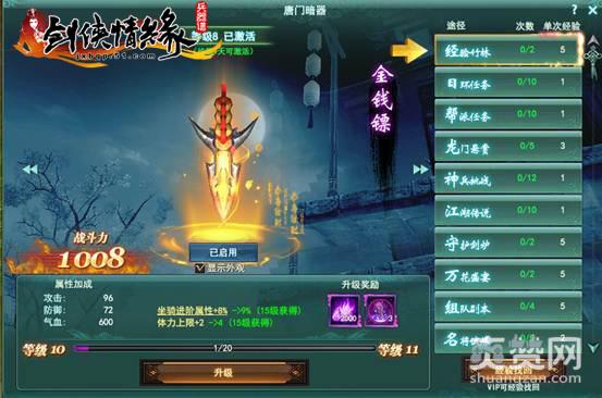 暗器升级后可激活不同暗器外形,等级越高,暗器的战斗力越高,外形越炫酷,仔细看,暗器可以绕着角色旋转哦。另外每次升级暗器,都可以获得一定的升级奖励。