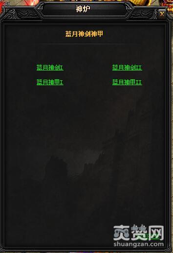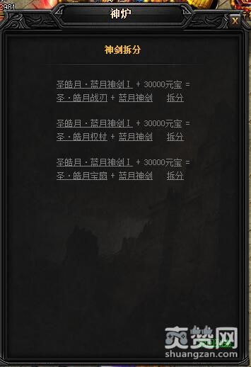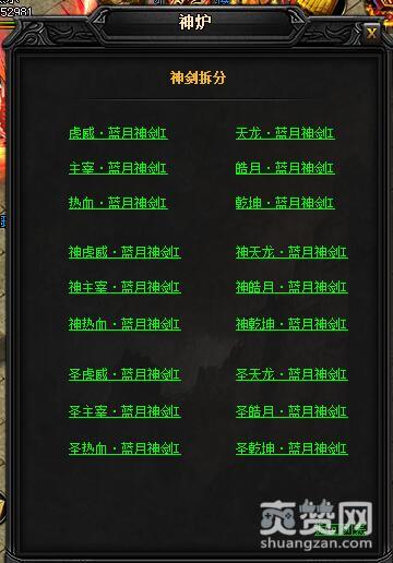 拆分的方法是到神炉处,点击蓝月神兵中的神剑神甲,然后在弹出的对话框中选择一项。这里我们选择的是蓝月神剑I。