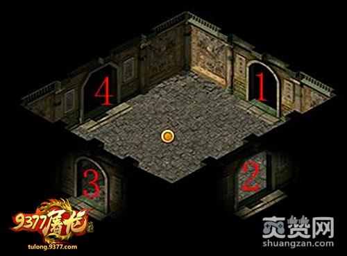 在9377《屠龙战记》挑战地图,玩家要通过重重迷宫才能见到BOSS。9377《屠龙战记》祖玛阁地图中四个传送口已经用数字标注,方便大家理解。9377《屠龙战记》祖玛阁入口走法为:左-上-上-上-右(即图中4-1-1-1-2)。通过上述走法,玩家即可到达BOSS所在的房间,而房间中的魔化祖玛教主BOSS的刷新时间为45分钟。