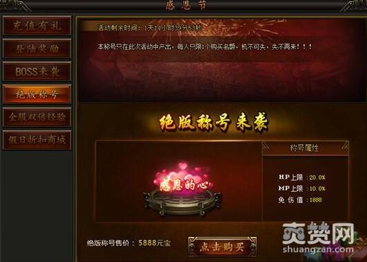 活动内容:活动期间感恩节绝版称号低价出售,机不可失,失不再来!每人限1个购买名额
