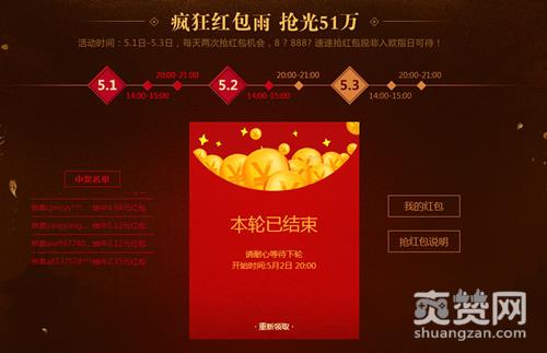 让红包雨来的更猛烈些吧!5.1日到5.3日活动期间,51游戏“玩家节”的活动页面每天两波疯狂红包雨,14:00-15:00、20:00-21:00每轮发放5151个红包,持续一个小时,直至红包被抢完。而在这些红包里有51币红包也有返利红包,有多也有少,能抢到什么样的红包就各凭运气了。而抢夺资格更是最低门槛,只要你是51游戏用户或者注册51游戏账号,都可以来抢夺红包。记住我们红包雨时间,等你来抢!