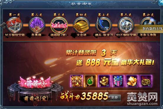 登录第三天,萌萌哒的宠物就送你了。照样是经验玉,照样有元宝,至于铜币、石头在此就不再多说了。