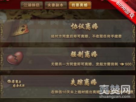 所谓游戏人生,其实游戏和现实人生也是一样,有一生幸福的婚姻,就有错误的婚姻,所以新热血江湖中,结成侠侣生活一段时间,如果双方不满意还可进行离婚。离婚的方式有3种。第一种是协议离婚,经双方同意后就可以离婚,不需要收取任何手续费。第二种是强制离婚,支付500元宝就可解除关系。第三种是失踪离婚,伴侣10以上没有上线就可提出离婚。