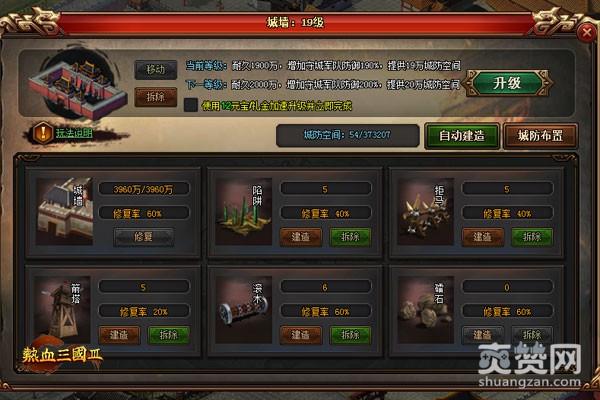 城墙是守城的根本。玩家可以建设升级自家的城墙,升级后的城墙耐久度会提高,并且对城内的守军有一定的属性加成,特别对于守军的防御、城防道具、远程兵种的射程有大幅度提升,高等级的城墙甚至能将城内士兵的防守实力提高50%以上。陷阱、拒马、箭塔、滚木、擂石五大城防设施,构成城防中坚力量。这些城防设施会在敌军来犯时自动防御,对敌人造成各种毁灭性的打击,陷阱被隐蔽在城外的各种地方,任何敌人都可能掉落其中;拒马由尖利的木头排列而成,阻挡敌人通行,速度越快的敌人受到的伤害越大,对抗骑兵攻城的最大利器;更别说箭塔、滚木、擂石都有其特殊功效,守城时能力超乎你的想象。