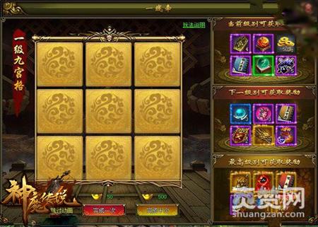 首先我们来看一下玩法,玩家每天可进行一次免费的九宫格玩法,九宫格中有三张表情一样的牌一定会在一条线上。玩家每轮消耗50元宝,可以进行5次翻牌,5次翻完牌或翻出3张表情一样的牌,一轮结束。九宫格共有5个等级,每轮结束无论结果如何,皆有几率升级,降级或不变。一轮玩法中翻出全部三张表情牌获得下级奖励,未全部翻出三张表情牌获得本级奖励。