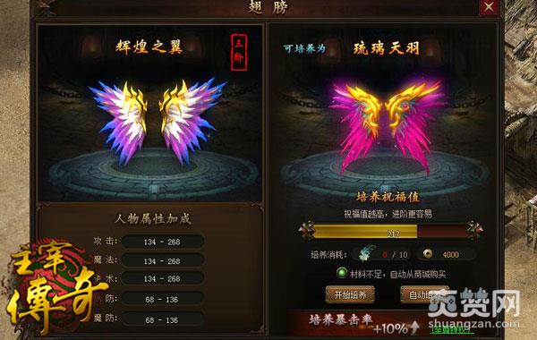 玩家使用羽毛和绑金就可以培养翅膀,翅膀等级越高,人物属性加成就越大。不是只有一种属性哟,是五大属性:攻击、魔法、道术、物防和魔防!