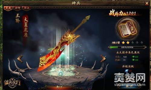 有着如此强大的基础当然要好好强化,神兵进阶消耗“九天玄铁”增加进阶值,获取大量进阶经验。进阶值进度条满后即可激活一颗星,获得部分属性加成。当5颗星全部激活后,神兵就成功升阶了,进阶值永久不清零,随着神兵等阶的升高神兵外形将越加帅气,同时还有大量属性加成。另外界面上可点击“开始进阶”按钮,预览下一阶段神兵外观。
