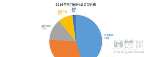 2015年,微信的火爆带动了H5行业的发展,朋友圈成为H5传播的一片沃土。无论是活动推广、产品宣传还是热点炒作,H5都能迎合各个行业多种信息的传播需求,展现出它的惊人传播力。 纵观2016年的H5作品类型数据, 除了心灵鸡汤类作品继续在H5传播领域大行其道,你绝对猜不到每3到4个H5里,就有1个是游戏!H5小游戏成为近几年来的新秀,是移动轻应用模式,无须下载App,手机点开即玩。其便捷性和碎片化的特点,迎合移动端用户的使用习惯,并且通过微信朋友圈等社交平台快速传播,达到却无处不在。不难预知,H5游戏必将成为H5行业的重头戏。