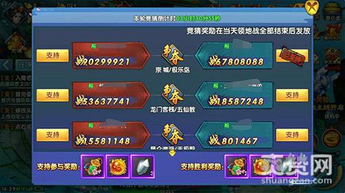 在领地战界面可以看到,在战场中可以获得攻击宝石、防御宝石、装备强化石等丰富奖励。为了让领地战更加充满趣味性,玩家除了参战获得奖励以外,还可在参与到对战精彩功能。在其中玩家可以选择支持争夺某一座城的任何一方帮派势力,在当天领地战全部结束后会根据竞猜结果发放奖励。在其中只要参与到竞猜活动中来就可以获得神兽精魄、装备强化石等奖励,而且玩家支持的一方胜利后还可获得更多的奖励!