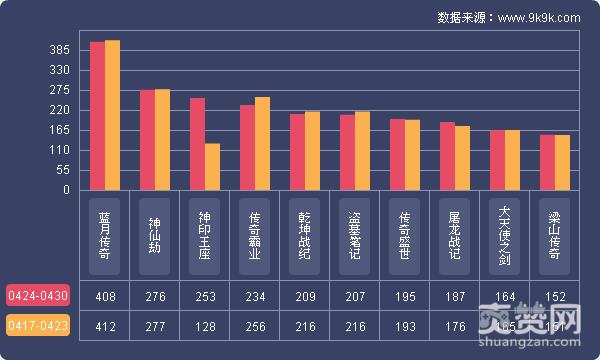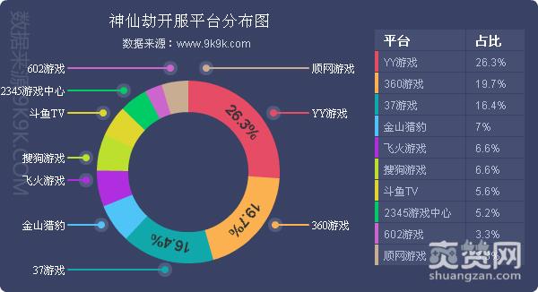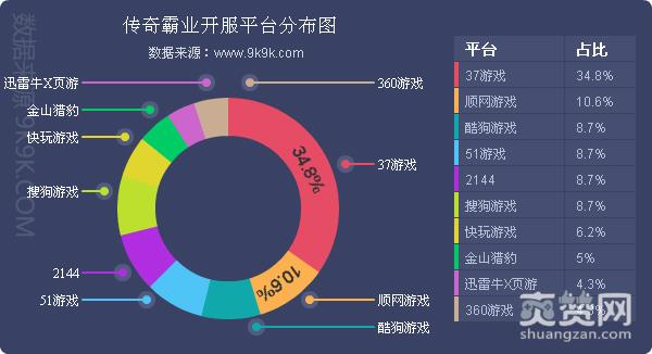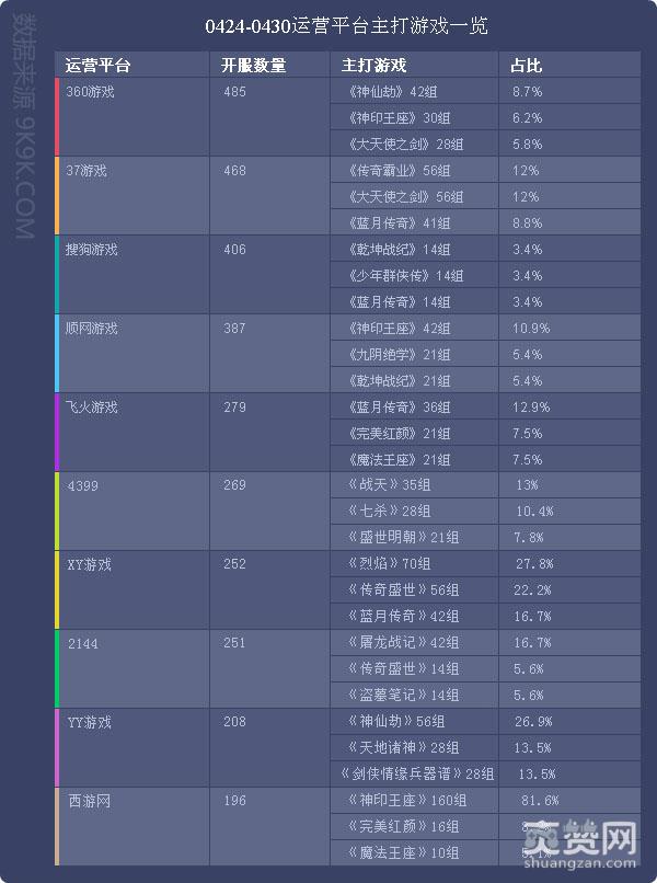 点评: 本周《传奇霸业》开服数减少了8.6%,其在快玩游戏的开服频率有所下调,其余各平台开服形势相对稳定;新增分布占比平台金山猎豹、360游戏。