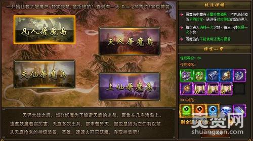 屠魔岛是萝卜玩《神魔传说》特色挑战系统,同时这也是一个打宝练级的好地方!在萝卜玩《神魔传说》中,屠魔岛可以掉落所有升阶、合成材料,只要有耐心再加上一点运气,屠魔岛可以满足你所有的心愿。一共有四个屠魔岛,凡人屠魔岛、天人屠魔岛、天仙屠魔岛、上仙屠魔岛。分别对应不同的等级实力,可以自行选择要去那个屠魔岛刷怪。